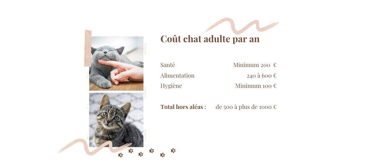 La première année représente un coût supérieur puisque si vous n'avez pas déjà de chat, tous les accessoires sont à acheter et certains frais vétérinaires sont à prévoir.