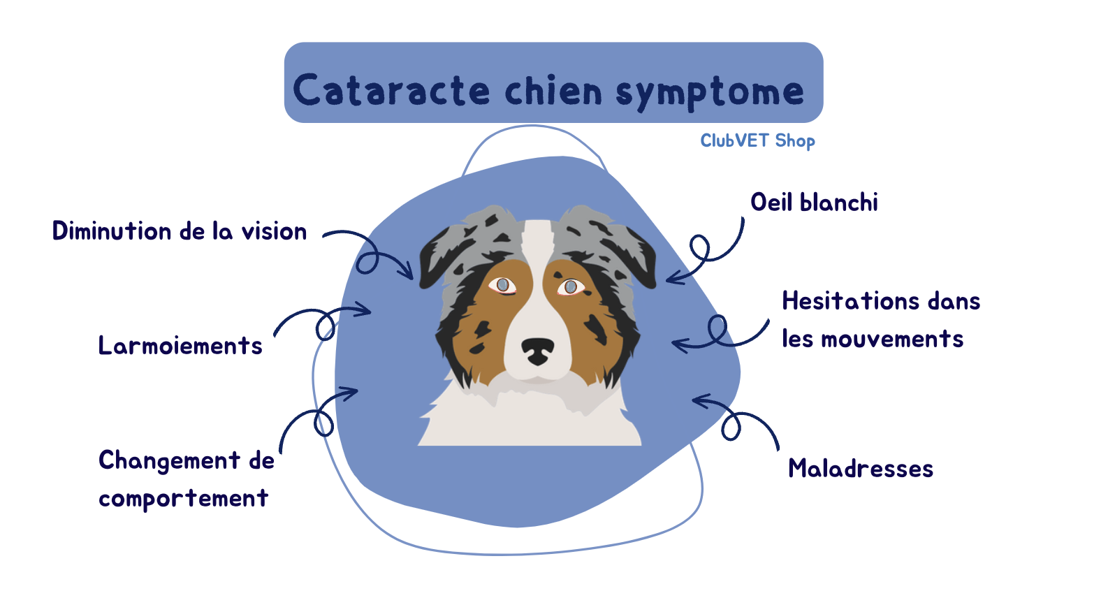 Ce trouble affecte la vision du chien, le cristallin devient opaque et empêchant la lumière d'atteindre correctement la rétine.Il en résulte une vision floue, voire une perte de vision totale.