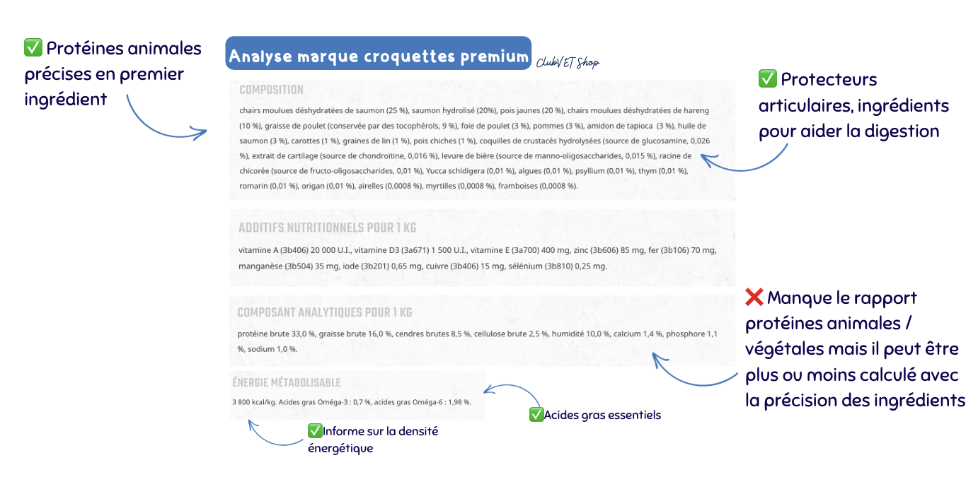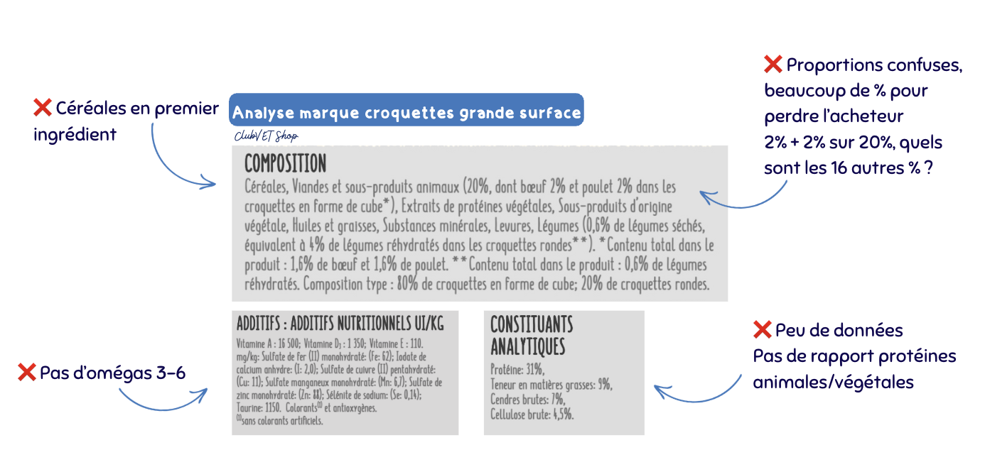 - Supermarché : souvent peu de visibilité sur la traçabilité des ingrédients. Les sous-produits peuvent rester non identifiés, et les formulations utilisent parfois des synonymes pour masquer la présence de céréales ou d’autres composants. Le marketing peut être trompeur : des mentions comme « premium » ou « ultra » ne garantissent pas forcément que l’aliment réponde réellement aux besoins nutritionnels de votre animal. La législation est malheureusement trop permissive sur les emballages et ne protège pas le consommateur.